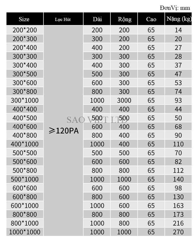 Bảng Thông Số Kỹ Thuật Bảng Thông Số Kỹ Thuật Bàn Hút Chân Không Giữ Kẹp Phôi Cho Máy Phay CNC