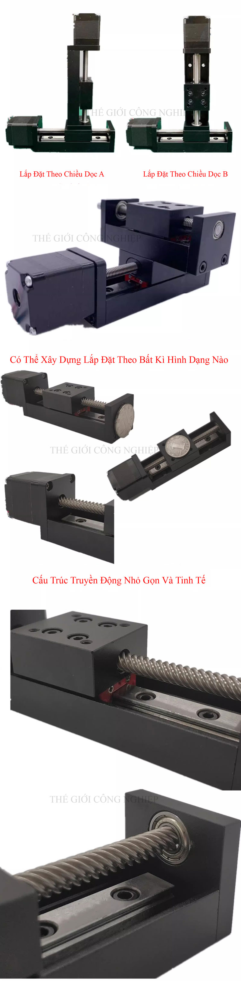 - Trục vít me (T6): Sử dụng thép không gỉ với độ chính xác cao, đảm bảo chuyển động mượt mà và tuổi thọ dài lâu.