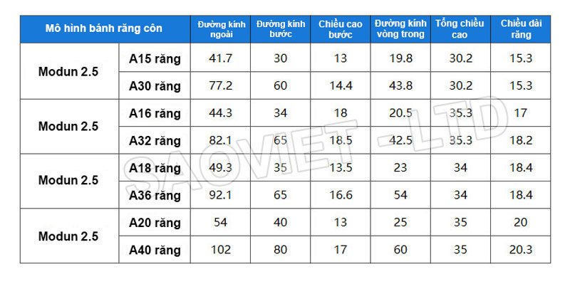 Số modun : 1 - 1.5 - 2 - 2.5 - 3