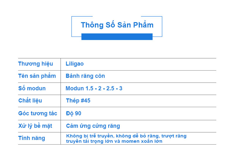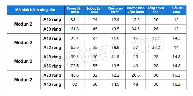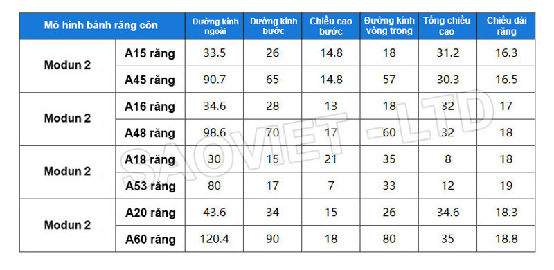 Số modun : 1 - 1.5 - 2 - 2.5 - 3