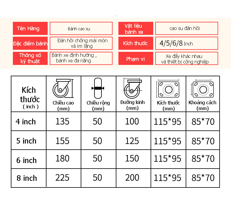 Với những đặc tính trên thì Bánh xe Caster Cao Su Công Nghiệp hứa hẹn sẽ là một sản phẩm chất lượng và không làm người tiêu dùng thất vọng. Còn chần chờ gì nữa mà không đặt hàng ngay hôm nay hoặc tham khảo thêm các sản phẩm khác.
