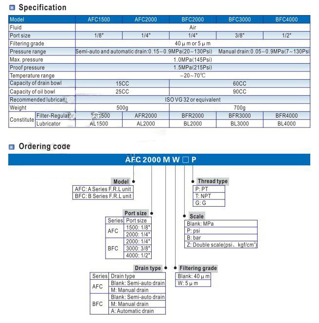 Bộ lọc khí nén AIRTAC series AFC và BFC có các model sau:
