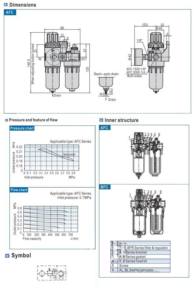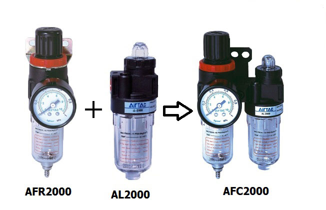 Bộ lọc khí nén AIRTAC AFC2000 là sự kết hợp giữa bộ đôi bao gồm: AFR2000 (lọc đơn + điều áp) + AL2000 (Bộ cung cấp dầu hoặc gọi là bôi trơn) tạo thành bộ lọc ba