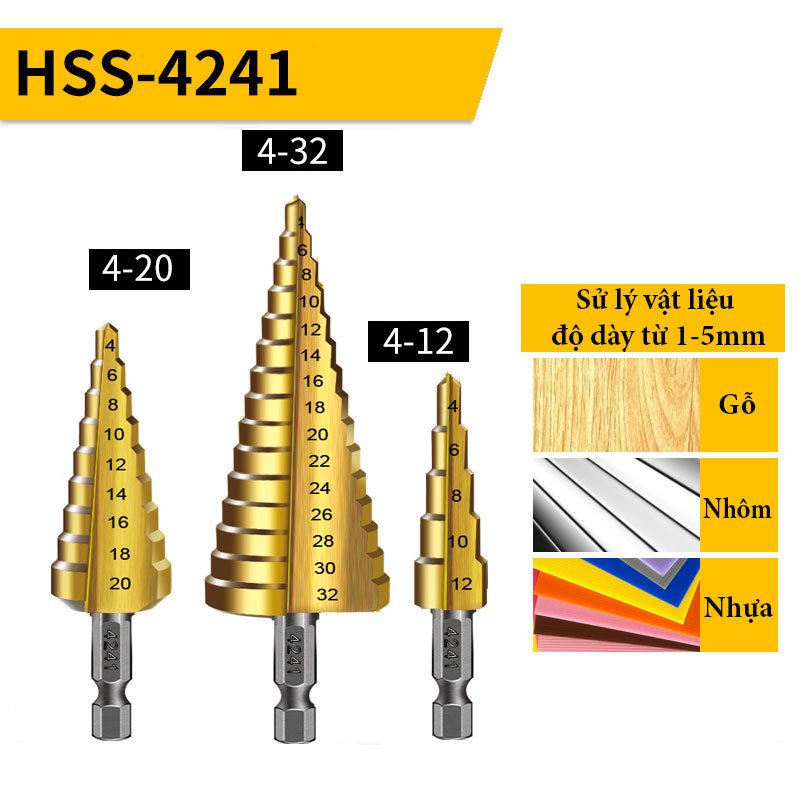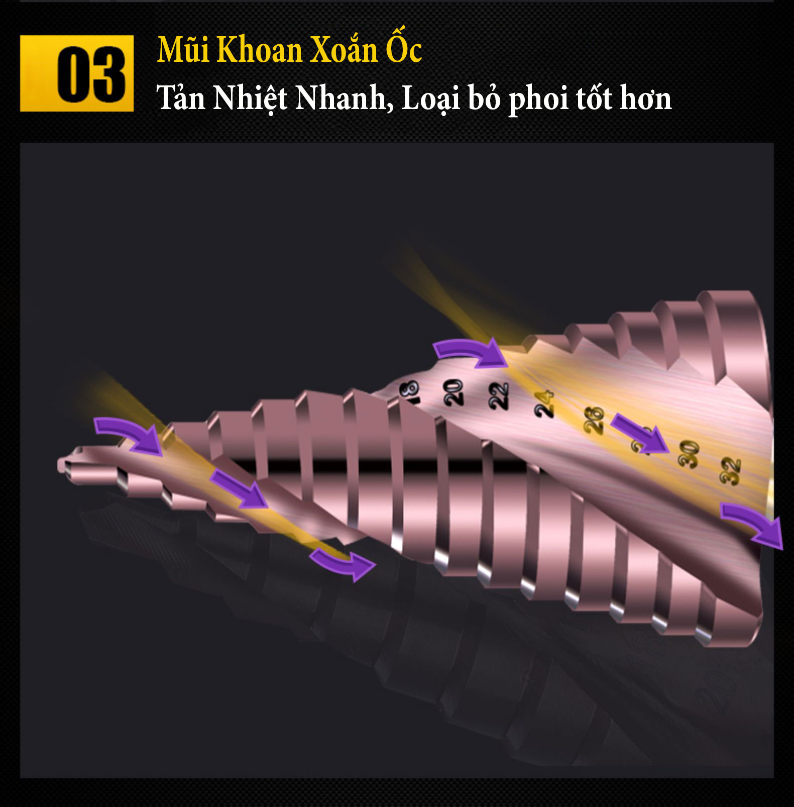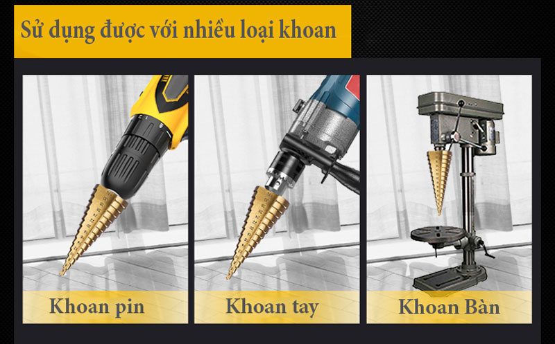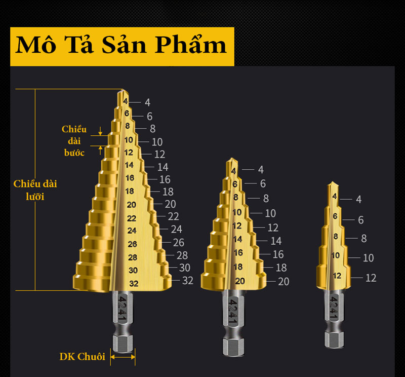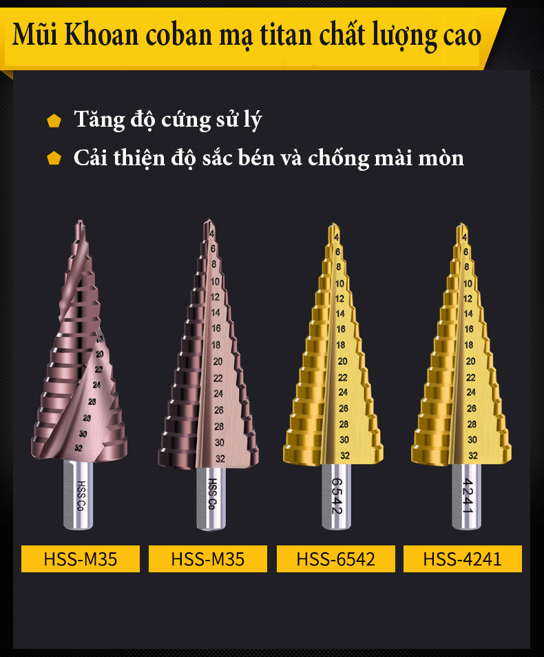 Mũi khoan tháp (Mũi khoan tầng) được làm bằng hợp kim inox 304 có độ cứng cực cao, được ứng dụng để khoan lên các vật liệu mà các loại mũi khoan thông thường không thể khoan được như inox, sắt, đồng... Với đường kính từ 4mm - 35mm bạn có thể khoan tạo lỗ, khoan doa, khoan phá theo các bước của mũi khoan từ 4mm, 5mm, 7mm, 10mm, 12mm, 15mm, 17mm, 20mm, 22mm, 25mm, 27mm, 30mm, 32mm, 35mm