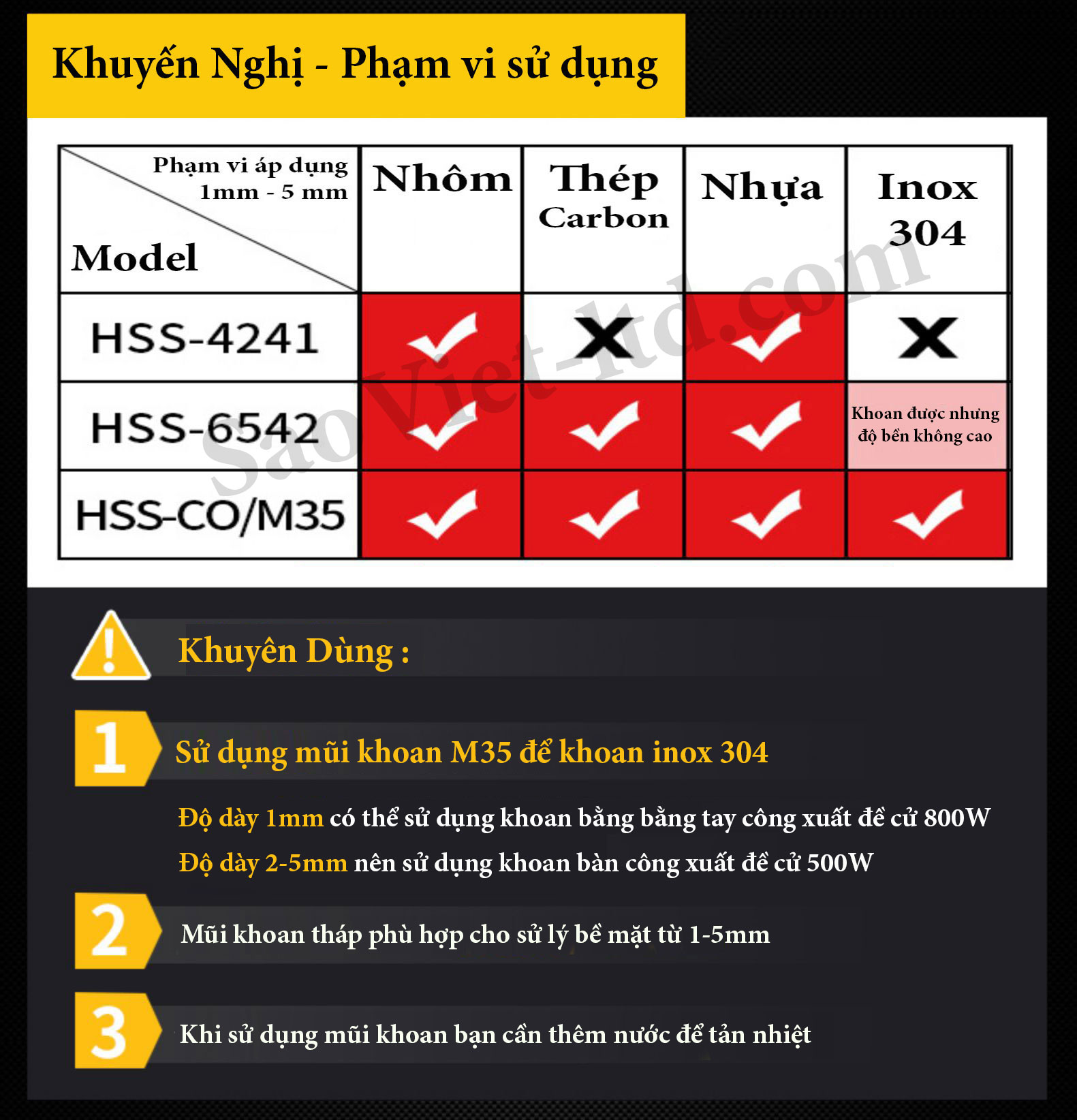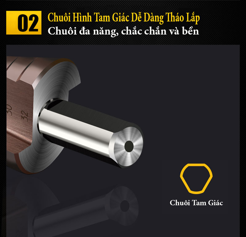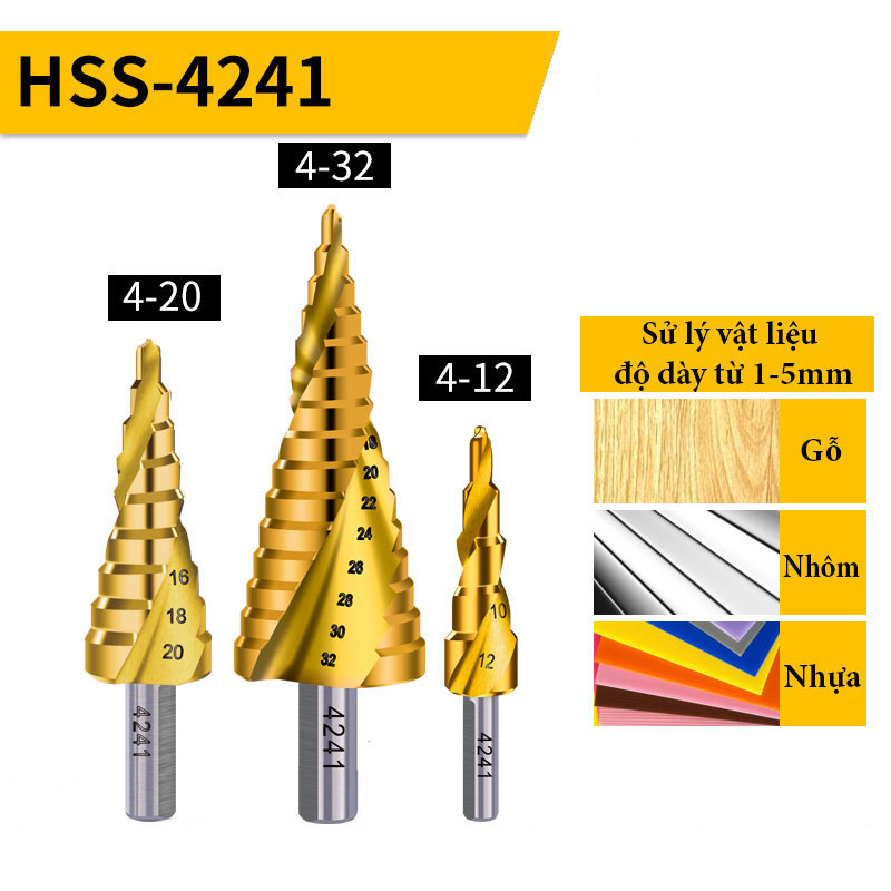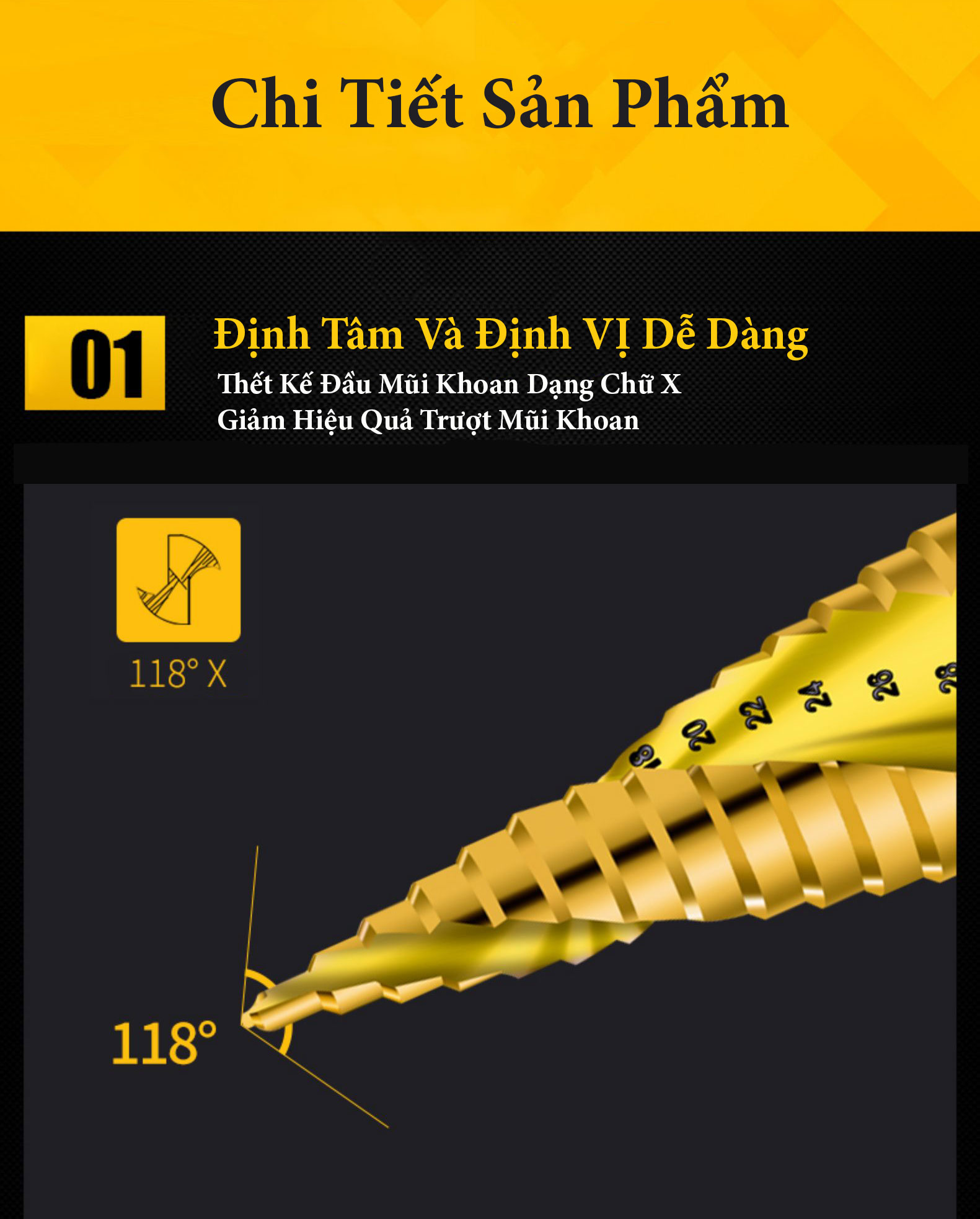 Mũi khoan tháp (Mũi khoan tầng) được làm bằng hợp kim inox 304 có độ cứng cực cao, được ứng dụng để khoan lên các vật liệu mà các loại mũi khoan thông thường không thể khoan được như inox, sắt, đồng... Với đường kính từ 4mm - 35mm bạn có thể khoan tạo lỗ, khoan doa, khoan phá theo các bước của mũi khoan từ 4mm, 5mm, 7mm, 10mm, 12mm, 15mm, 17mm, 20mm, 22mm, 25mm, 27mm, 30mm, 32mm, 35mm