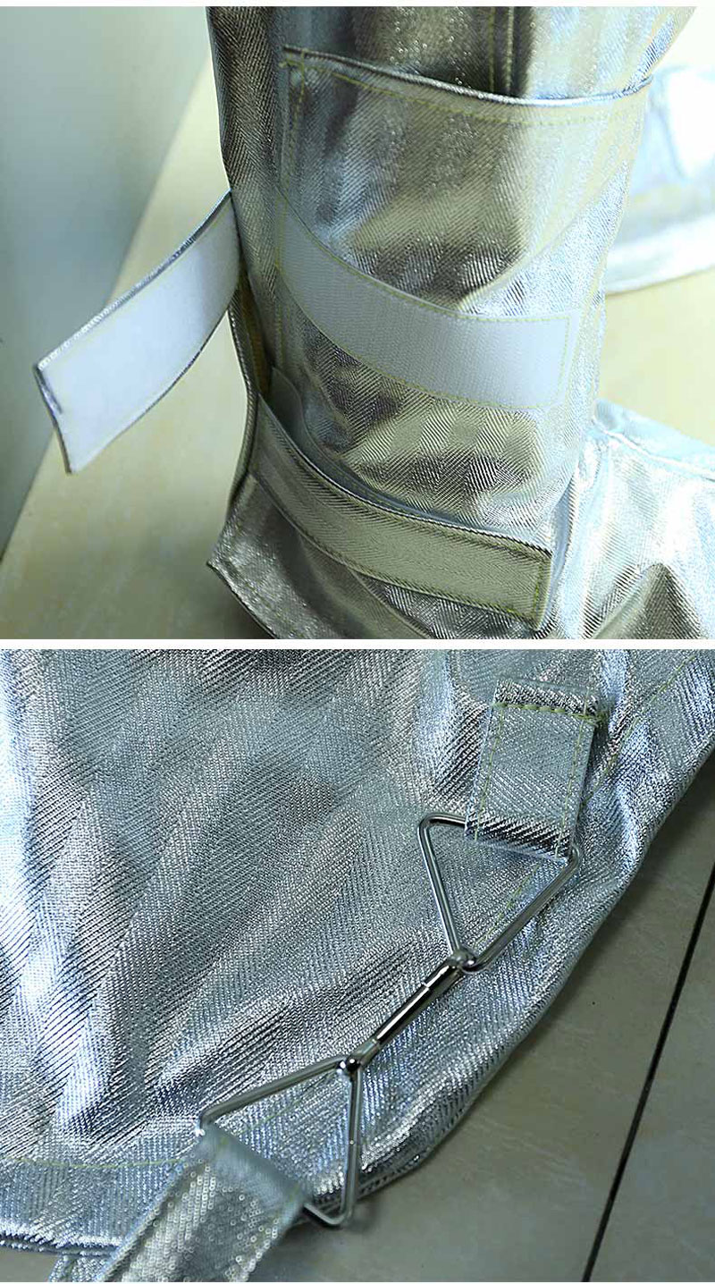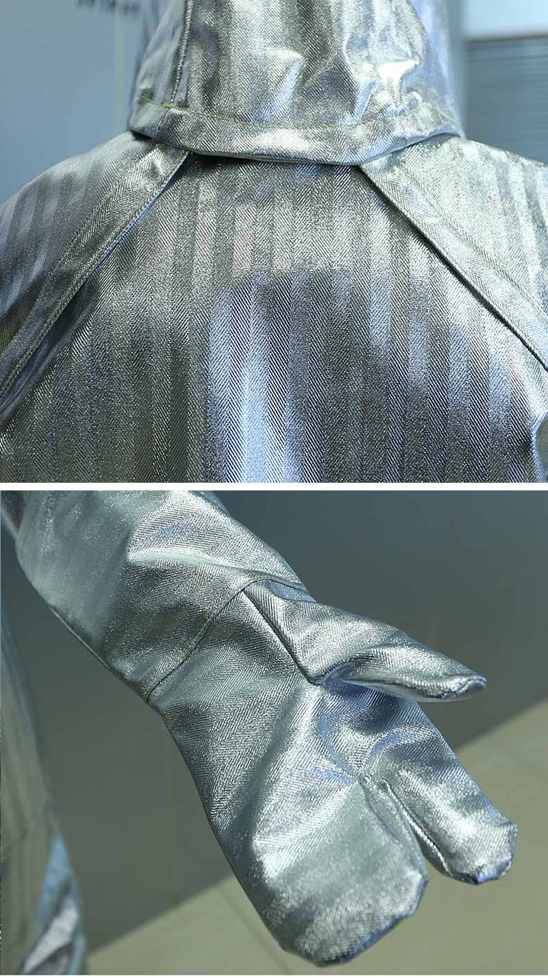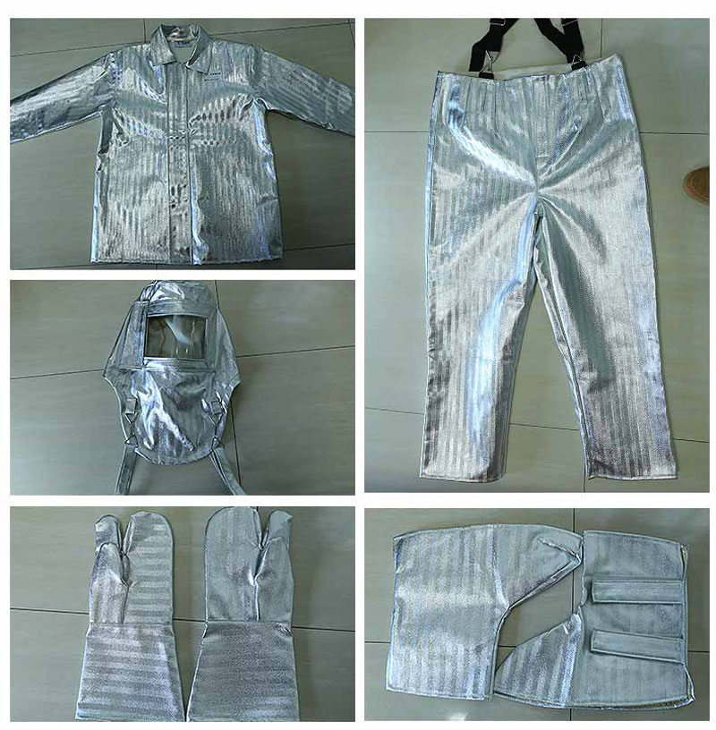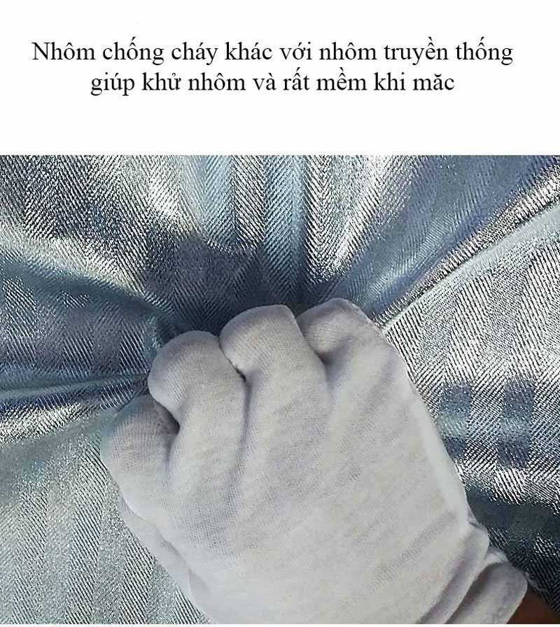 Làm bằng sợi thủy tinh tráng nhôm chống cháy không chứa amiang độc hại, chất liệu bóng chịu được nhiệt độ 1000 độ. 1 lớp tráng nhôm kỹ thuật theo kỹ thuật mới làm bộ quần áo mềm và nhẹ hơn. Quần áo gồm 2 lớp: 1 lớp tráng nhôm kỹ thuật theo kỹ thuật mới làm bộ quần áo mềm và nhẹ hơn và 1 lớp lót Aramid màu trắng bên trongChịu nhiệt: Chất liệu sần chịu được nhiệt độ 1000 độ Chất liệu: Phủ 1 lớp tráng nhôm kỹ thuật theo kỹ thuật mới làm bộ quần áo mềm và nhẹ hơn, chống hóa chất, chịu mài mòn Hạn chế lây lan ngọn lửa, thời gian cháy sau ngọn lửa là 0. Cường độ chống kéo căng > 4000N Cường độ chống xé rách > 1000g/cm3.