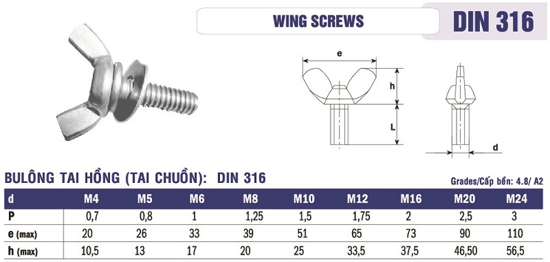 Bu lông inox tai hồng din 316 được sản xuất hang loạt theo tiêu chuẩn Din 316 của Đức, việc sản xuất hàng loạt theo tiêu chuẩn này mang lại giá thành rẻ cho sản phẩm, cũng như việc sản phẩm của nước này sản xuất vẫn lắp lẫn với sản phẩm của nước khác sản xuất được. Dưới đây là bảng tiêu chuẩn và quy cách Din 316 của bu lông inox tai hồng:
