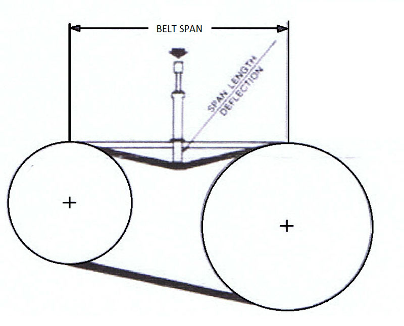 4. Đặt bút thử độ căng thẳng hàng trên một đai ở tâm của dây đai (xem hình vẽ “A”) Áp dụng lực hướng xuống của pít tông cho đến khi đáy của O-ring lớn đều với đai tiếp theo hoặc với đáy của một cạnh thẳng đặt trên các Puli.