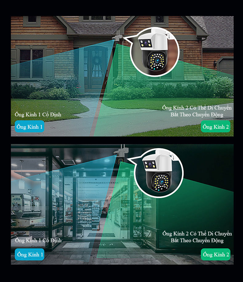 Màn hình kép: Camera Tích hợp 1 trên cùng cố định vị trí nhìn, 1 camera xoay 360 độ