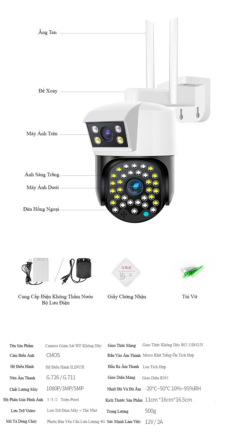 Thông Số Kỹ Thuật Camera Wifi Không Dây Ngoài Trời Chống Nước Quay Toàn Cảnh 360 Độ Tích Hợp Màn Hình Kép 2 Camera