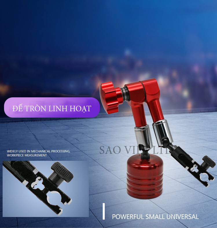 với 3 bậc tự do, khóa cơ ở trục giữa, Chuyên dụng cho những không gian khó định hướng. Thích ứng cho những phép đo biến đổi, vị trí và không gian đo đa chiều. Trụ của đế từ bằng hợp kim nhôm, chống mài mòn, khớp xoay vạn năng. Vít chỉnh mịn, núm xoay dễ cầm nắm và điều chỉnh tinh. Khối từ tính có lực từ mạnh, khóa đóng ngắt từ nhẹ. Núm xoay bằng nhựa cứng hoặc bằng nhôm.