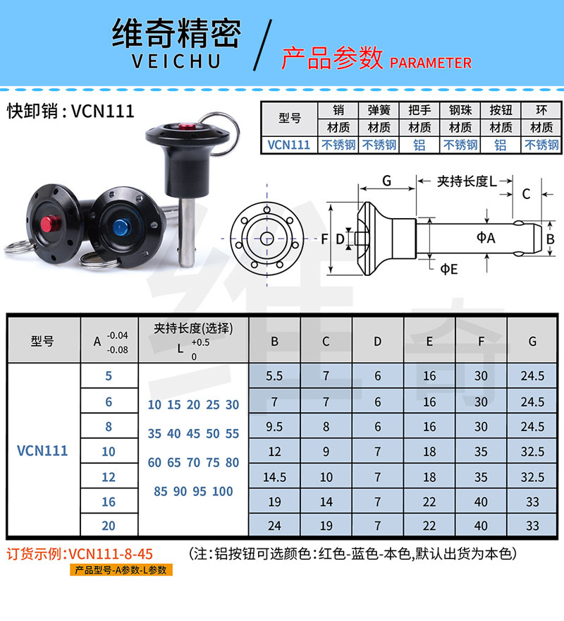 Bảng Thông Số Kỹ Thuật Chốt Khóa Đầu Núm VCN111