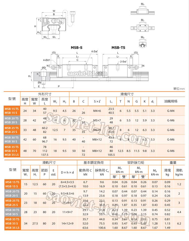 ĐẶC ĐIỂM CON TRƯỢT DÀI KHÔNG CÁNH PMI MSB15, MSB20, MSB25, MSB30, MSB35, MSB40, MSB45, MSB55, MSB65 TSSFCN