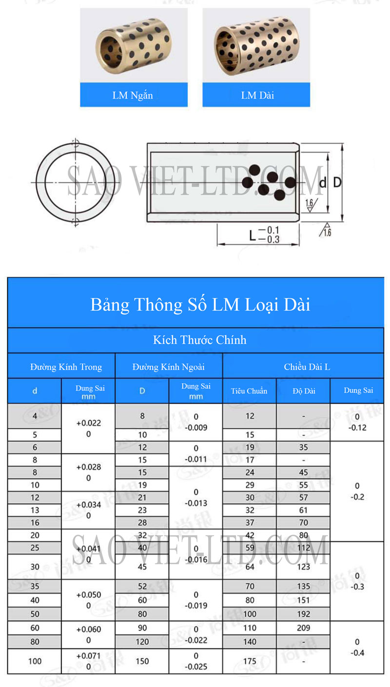 Bảng Thông Số Kỹ Thuật Con Trượt Đồng Tự Bôi Trơn LML