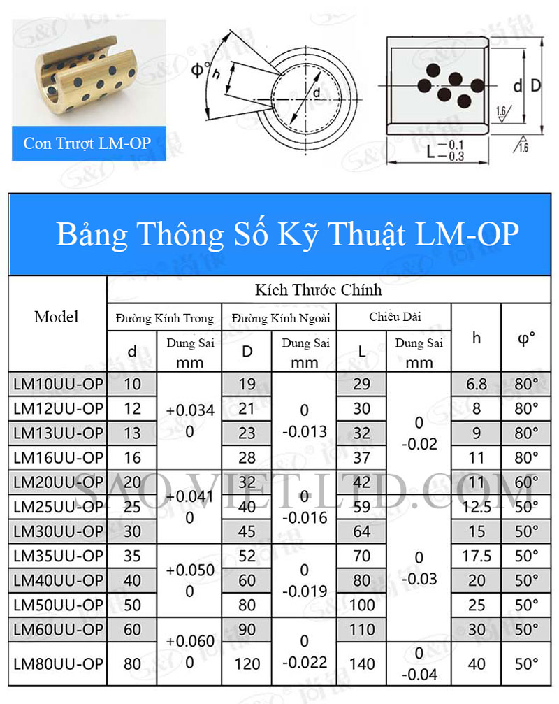Bảng Thông Số Kỹ Thuật Con Trượt Đồng Tự Bôi Trơn Loại Mở LM-OP
