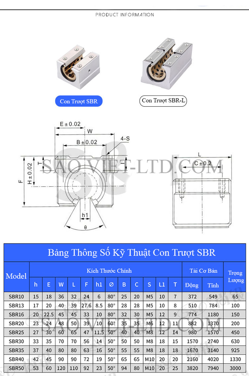 Bảng Thông Số Kỹ Thuật Con Trượt Đồng Tự Bôi Trơn Loại Mở SBR-OP