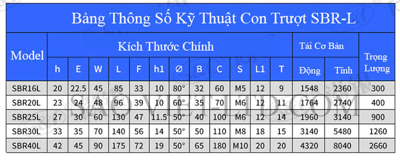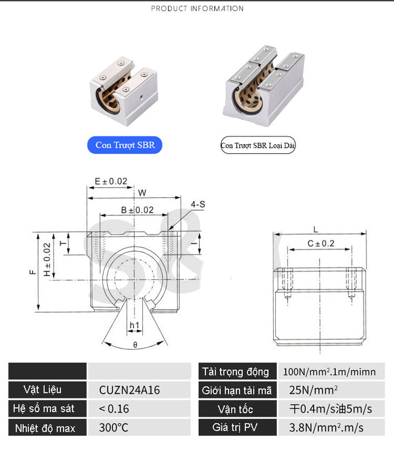 Bảng Thông Số Kỹ Thuật Con Trượt Đồng Tự Bôi Trơn Loại Mở SBRL-OP