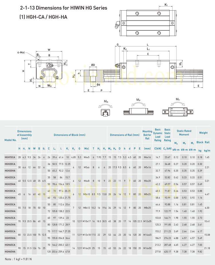 THÔNG SỐ KÍCH THƯỚC CỦA CON TRƯỢT HIWIN HGH45CA, HGH55CA, HGH65CA