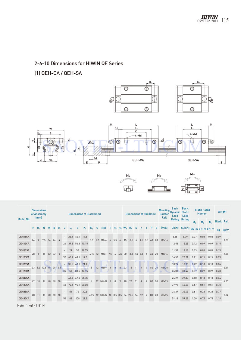 Bảng Thông Số Con Trượt Hiwin QEH15, QEH20, QEH25, QEH30, QEH35, CA, SA