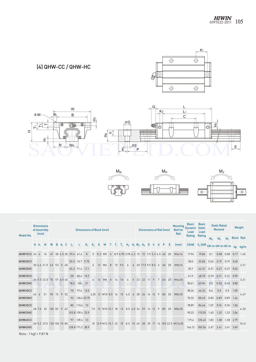 BẢNG THÔNG SỐ KÍCH THƯỚC CON TRƯỢT HIWIN QHW15CC, QHW20CC, QHW25CC, QHW30CC, QHW35CC