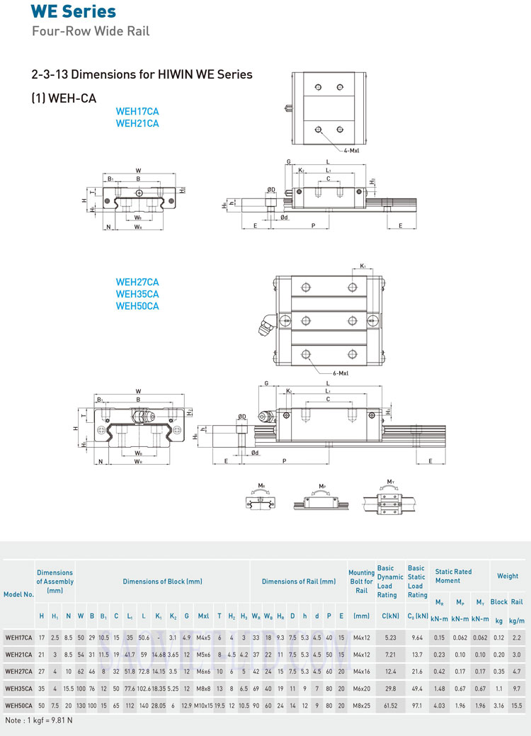 BẢNG THÔNG SỐ CON TRƯỢT HIWIN DÒNG WEH17CA, WEH21CA, WEH27CA, WEH35CA, WEH50CA