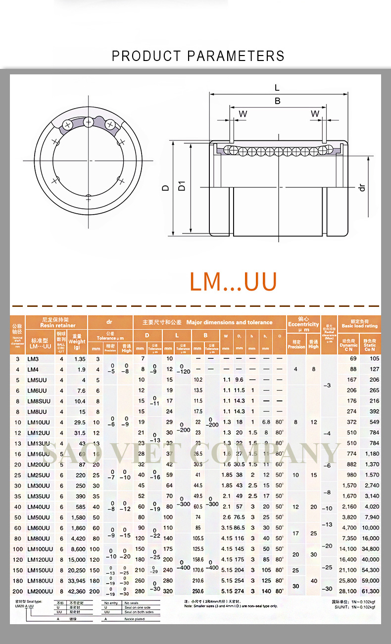 LM3UU, LM4UU, LM5UU, LM6UU, LM8UU, LM10UU, LM12UU, LM13UU, LM16UU, LM20UU, LM25UU, LM30UU, LM35UU, LM40UU, LM50UU, LM60UU, LM80UU, LM100UU