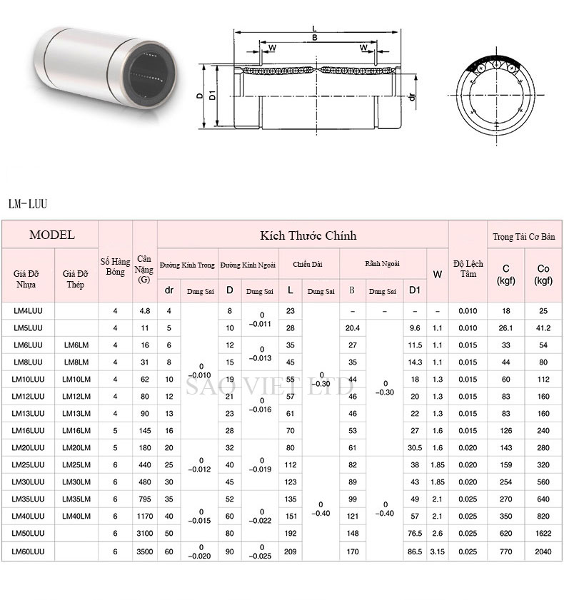 Bảng Thông Số Kỹ Thuật Con Trượt Tròn Loại Dài LMLUU