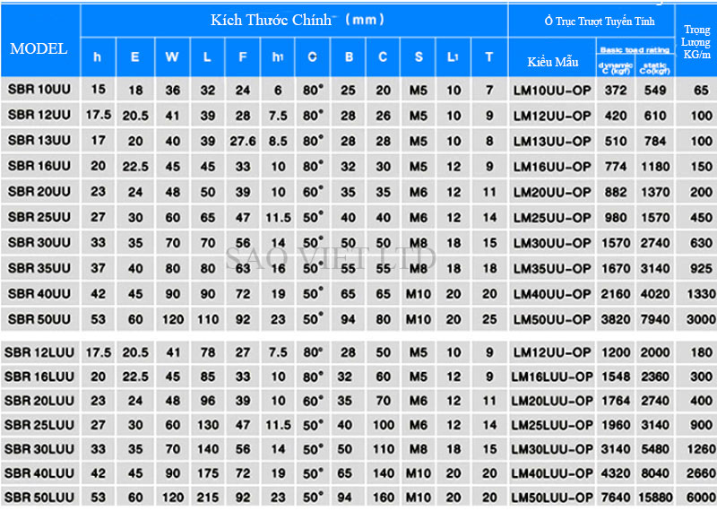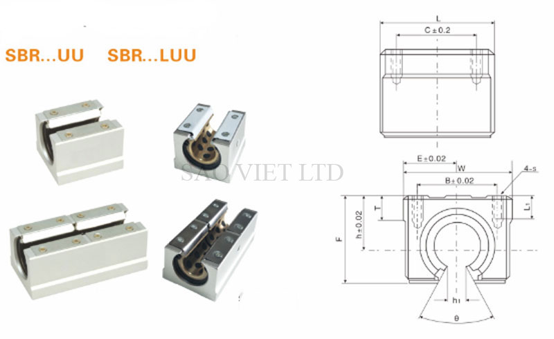 - Loại dài: SBR10LUU, SBR12LUU, SBR13LUU, SBR16LUU, SBR20LUU, SBR25LUU, SBR30LUU, SBR35LUU, SBR40LUU, SBR50LUU