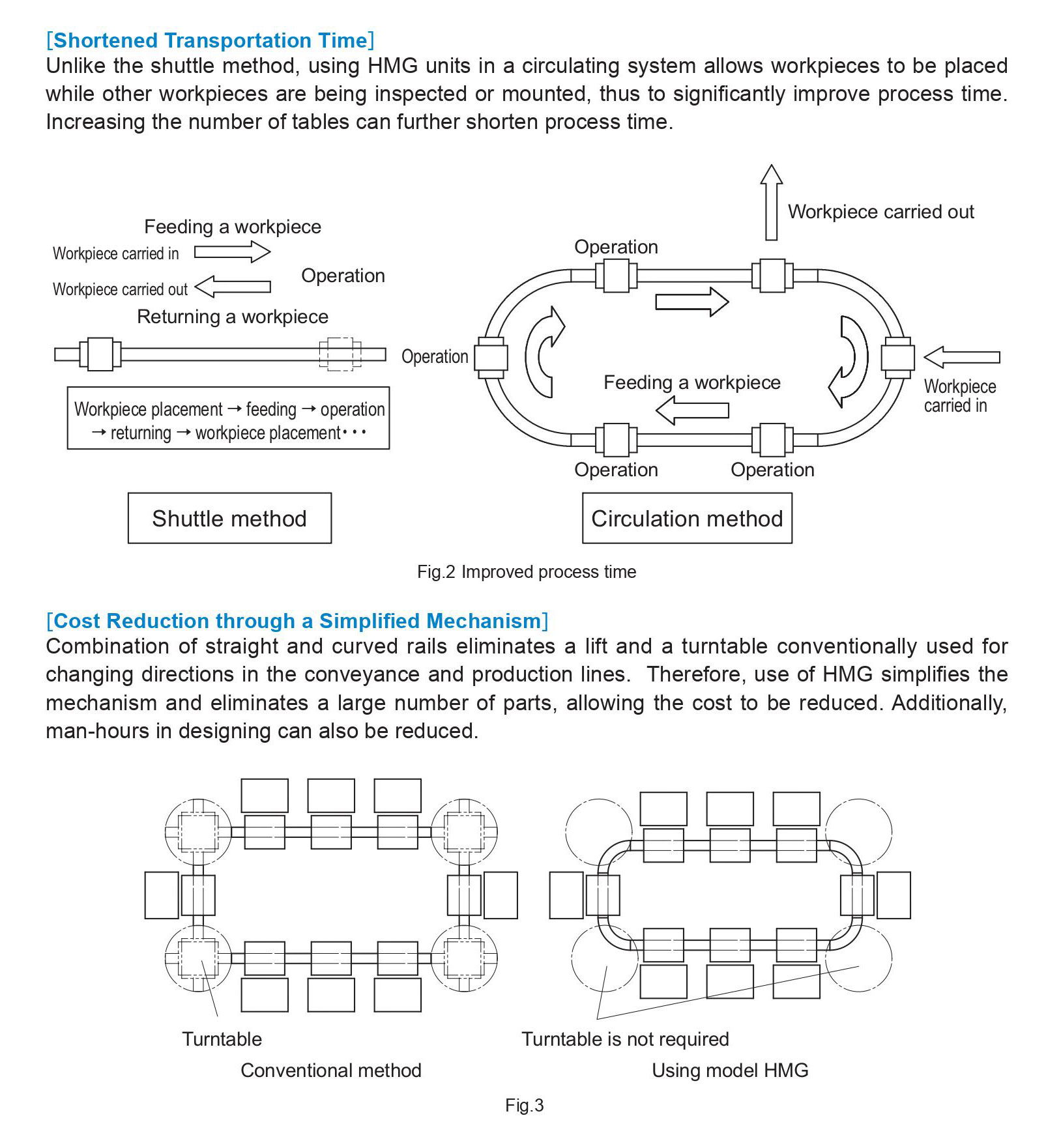 Sự kết hợp của đường ray thẳng và cong giúp loại bỏ lực nâng và bàn xoay thường được sử dụng cho thay đổi hướng trong dây chuyền vận chuyển và sản xuất. Do đó, việc sử dụng HMG đơn giản hóa cơ chế và loại bỏ một số lượng lớn các bộ phận, cho phép giảm chi phí. Ngoài ra, thời gian làm việc trong thiết kế cũng có thể được giảm bớt.