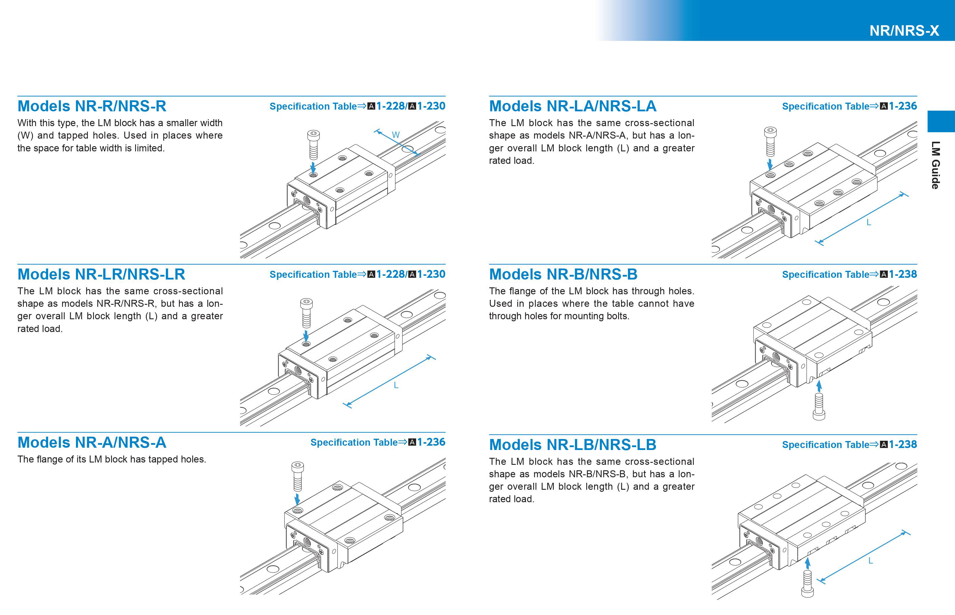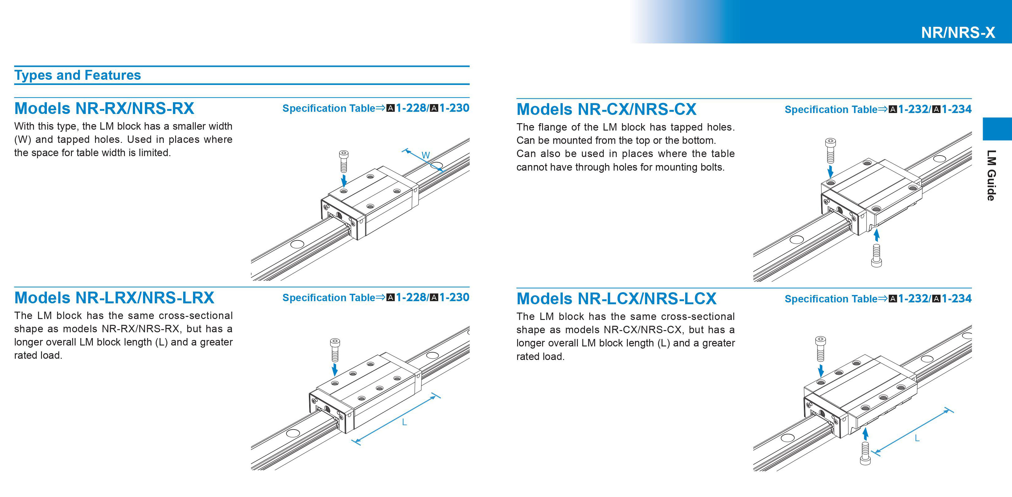 Để tăng độ cứng của khối LM và đường ray LM, điều này có thể làm giảm độ cứng tổng thể của. Hướng dẫn LM theo hướng xuyên tâm và hướng bên ngược lại, THK đã sử dụng đầy đủ FEM để đạt được thiết kế tối ưu trong phạm vi kích thước giới hạn. THK cung cấp hai mô hình có kích thước giống hệt nhau với các đặc điểm khác nhau, đó là Mô hình loại xuyên tâm NR-X và Kiểu 4 chiều Kiểu NRS-X. Người dùng có thể lựa chọn mô hình phù hợp nhất với thông số kỹ thuật của họ