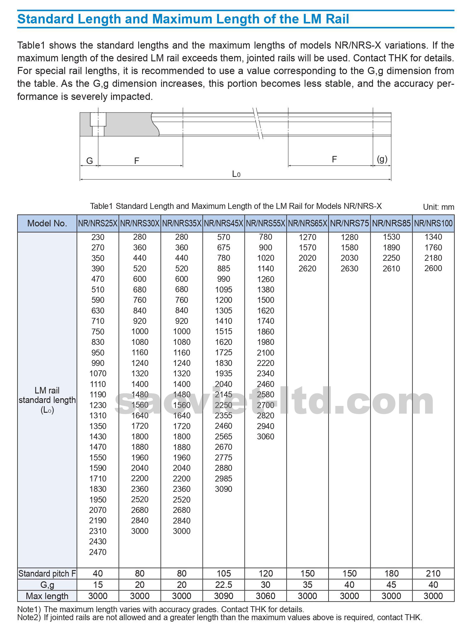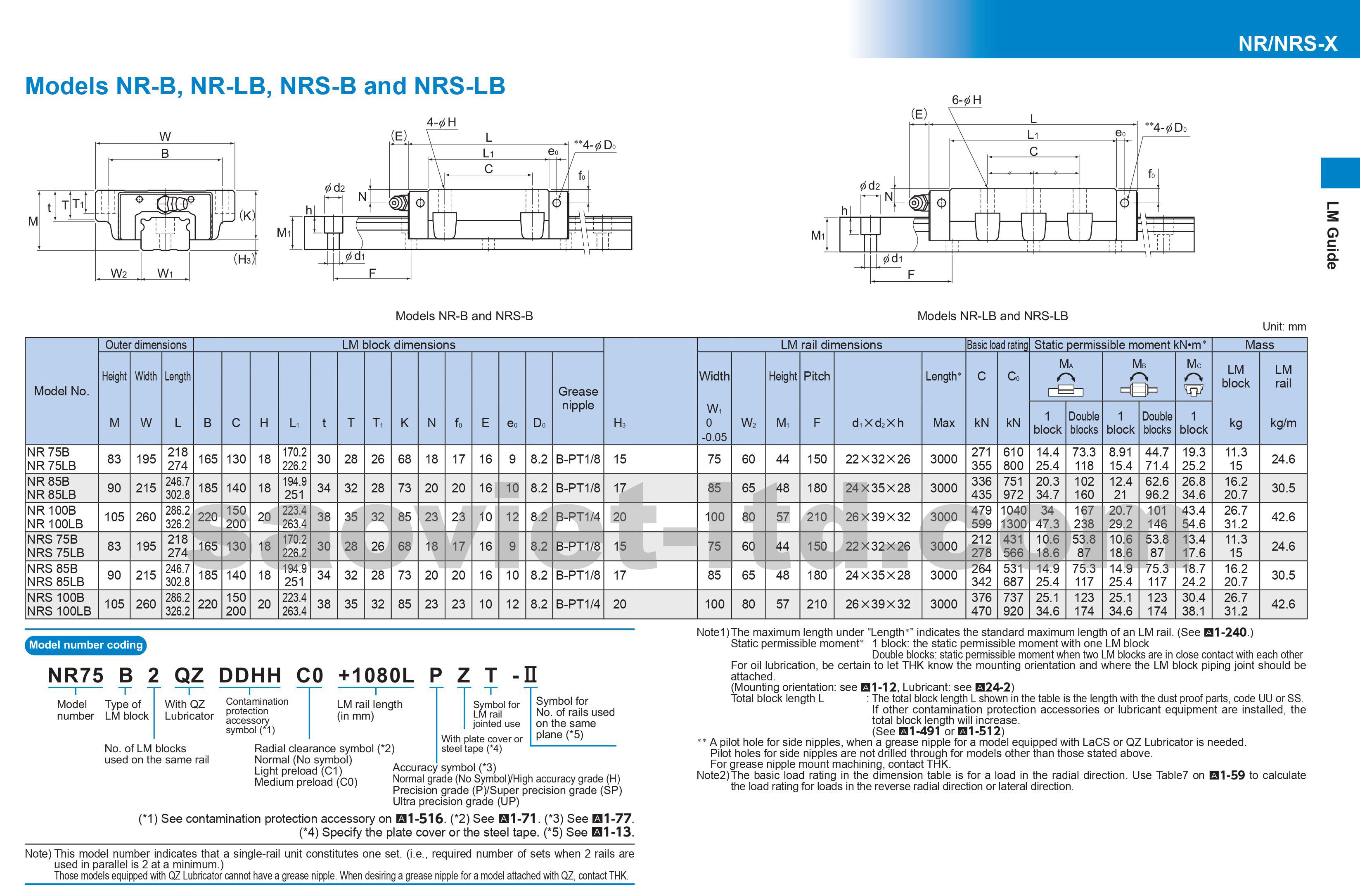 Thông số kỹ thuật con trượt vuông THK (THK NR/NRS)