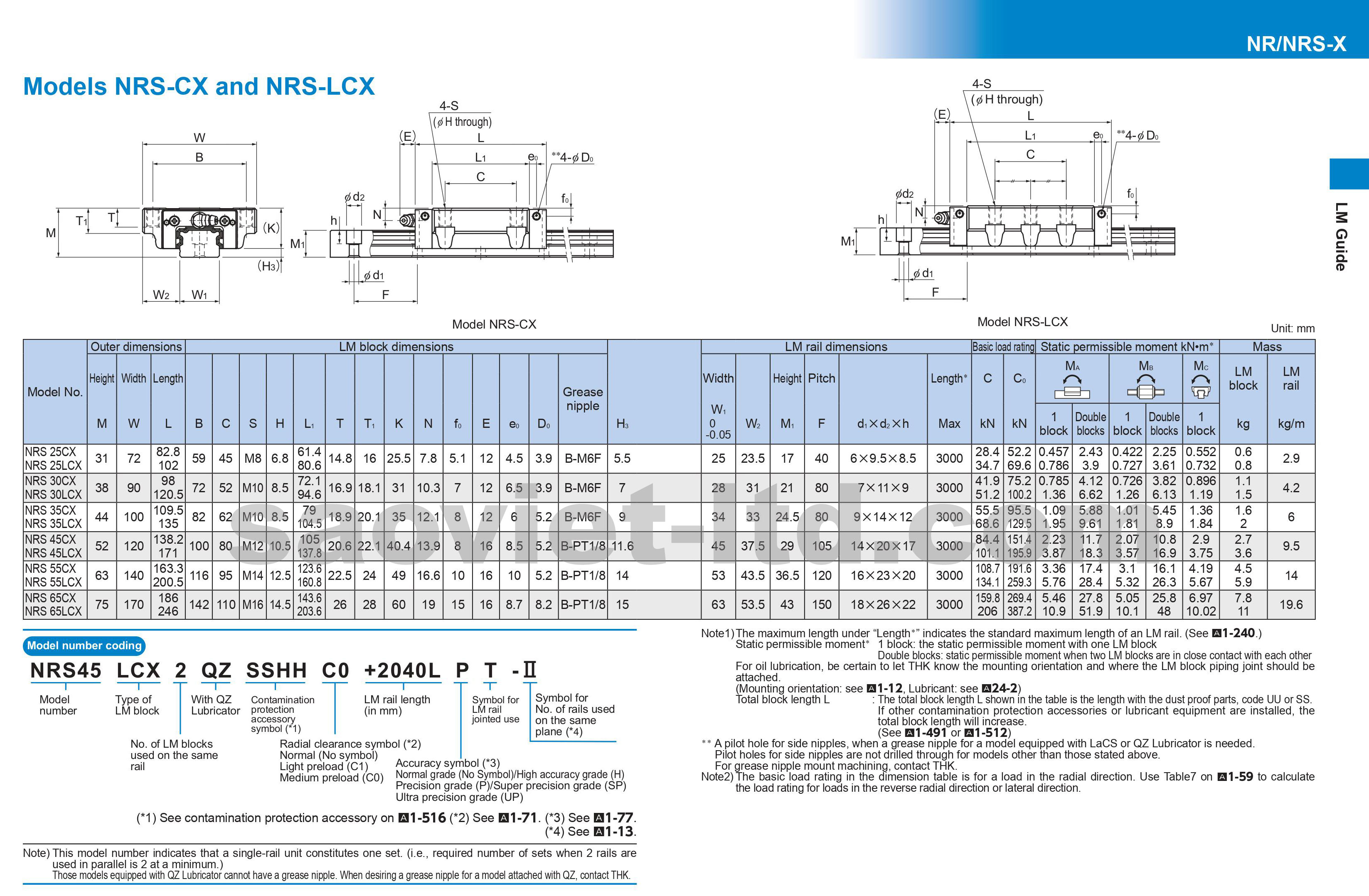Thông số kỹ thuật con trượt vuông THK (THK NR/NRS)