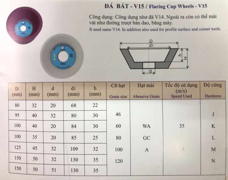 + Đá mài bát dạng kích thước 75mm, 100mm, 125mm, 150mm đường kính lỗ bắt trục thông dụng là phi 32, nếu phi 20 hoặc 16 thì có thêm bộ đệm long đen lỗ. cụ thể xem thông tin bản vẽ phía dưới bài viết