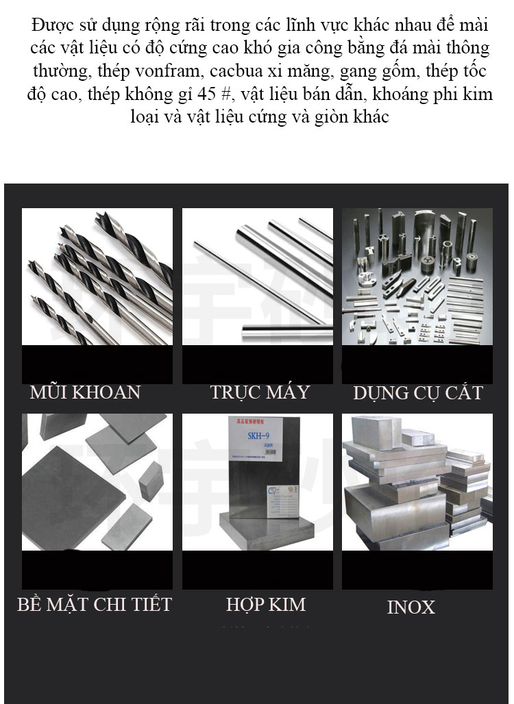 Nó có thể được sử dụng để mài và định hình các công cụ bằng thép vonfram. Bánh mài kim cương có thể duy trì hiệu suất ổn định về độ chính xác, độ mài và tuổi thọ và có thể được áp dụng để gia công nhiều vật liệu khác nhau. Nó có thể được áp dụng không chỉ cho các công cụ mài mòn, mà còn cho các công cụ chống mài mòn khác nhau