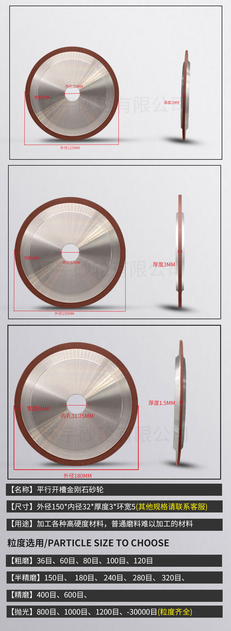 Độ nhám: Mài thô 100#, 120# , Mài tinh từ 150#-240#, Mài Siêu Tinh: 300# - 600#, #1000, Đến #3000