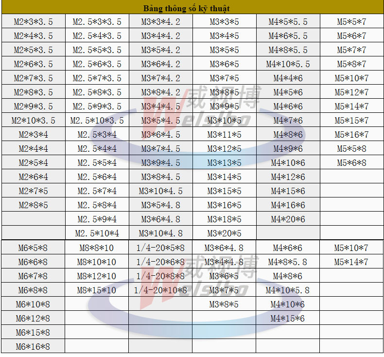Các kích thước của đai ốc từ M2, M3, M4, M5, M6 với chiều dài và kích thước đa dạng khác nhau, xin vui lòng tham khảo bảng thông số kỹ thuật phía dưới để lựa chọn chủng loại cho phù hợp.