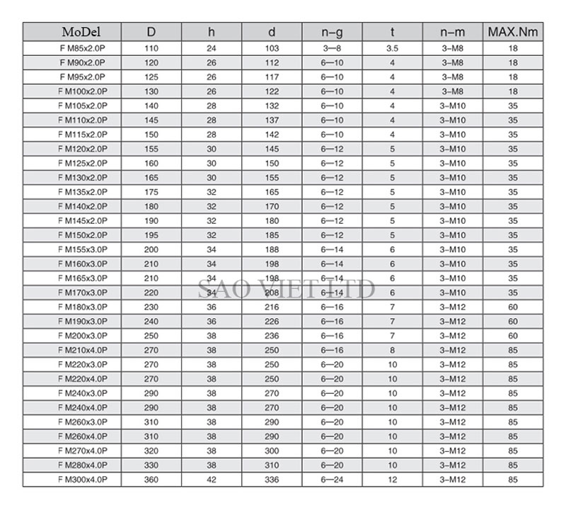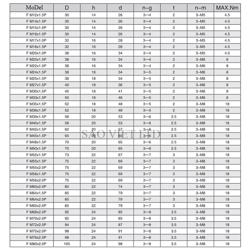 Bảng Thông Số Kỹ Thuật Đai Ốc Khóa Trục Chính Xác Kiểu F