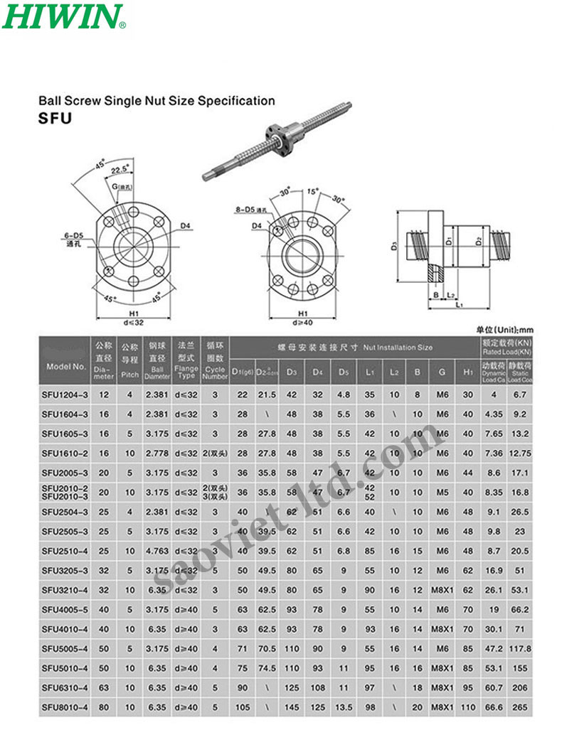 Đai ốc vít me bi hãng HIWIN đường kính trục mini kích thước tham khảo bảng thông số từ 12,16,20,25,32,40,50,63,80