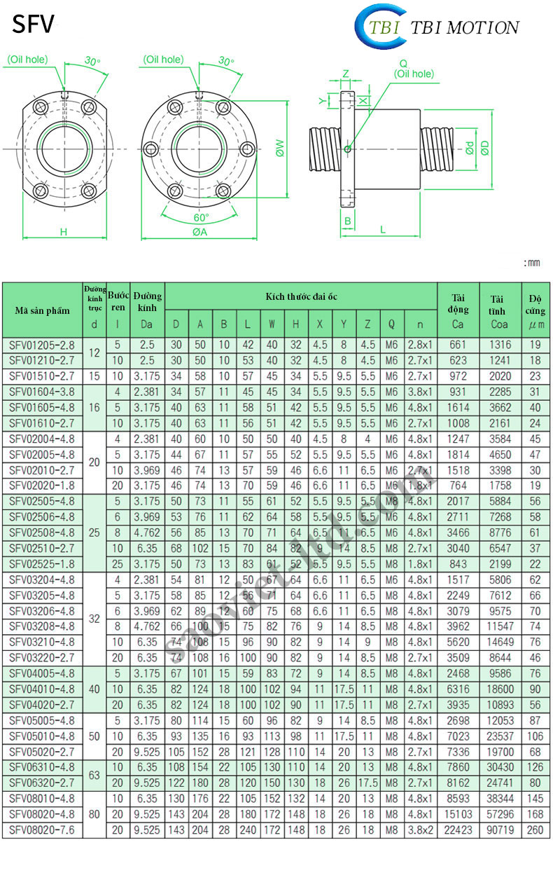 Đai ốc vít me bi hãng TBI đường kính trục mini kích thước tham khảo bảng thông số từ 12,16,20,25,32,40,50,63,80,100