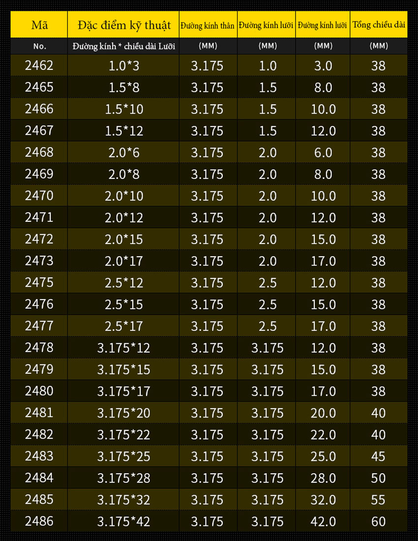 BẢNG THÔNG SỐ KỸ THUẬT DAO PHAY HAI LƯỠI CNC