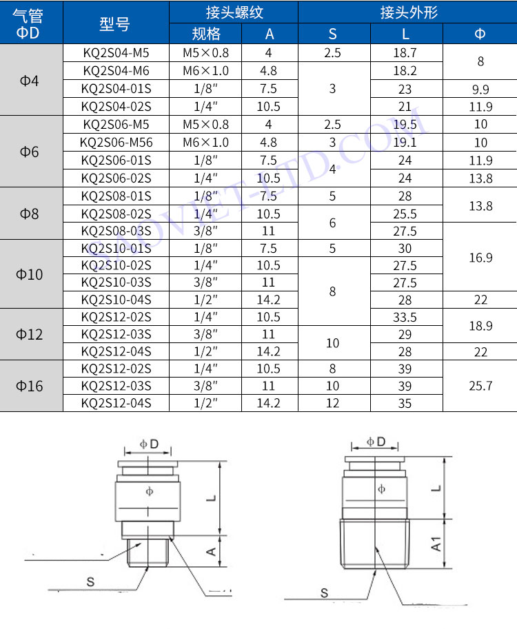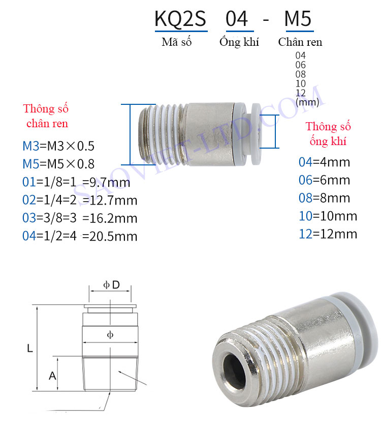 Model: Đầu Nối Khí Nén SMC Loại KJS3, KJS4, KJS6 Chân Ren M3 Hoặc M5