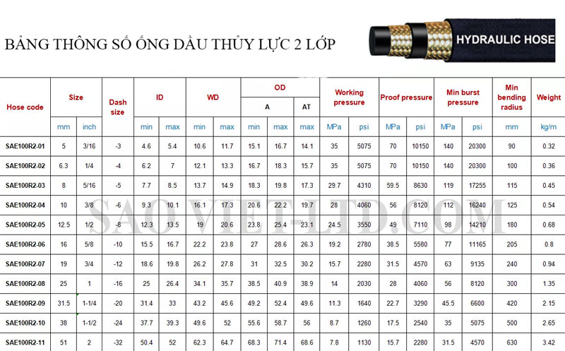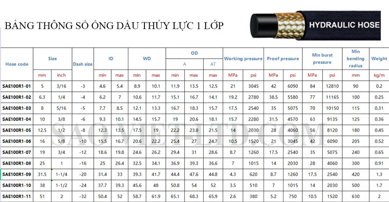 + Mã kích thước ống dây ví dụ: SAE100 R1 (dây một lớp)