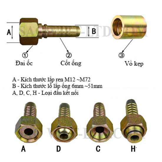 + Kích thước đai ốc bắt ren A: M12, M14, M16.... ren hệ mét