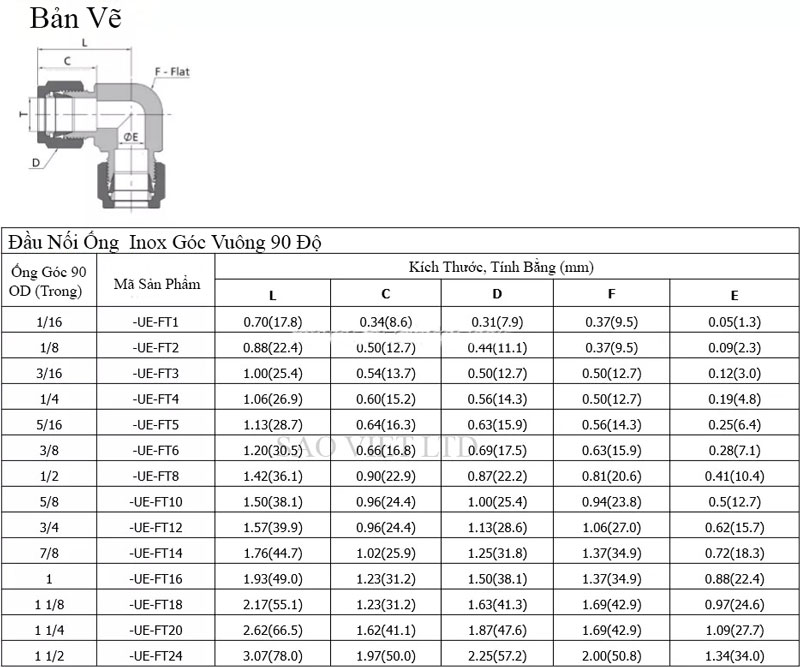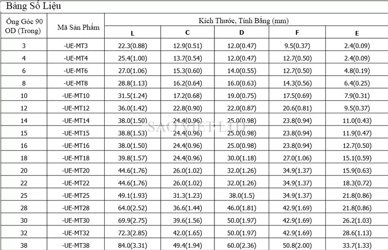 Bảng Thông Số Kỹ Thuật Đầu Nối Ống Inox Góc Vuông 90 Độ