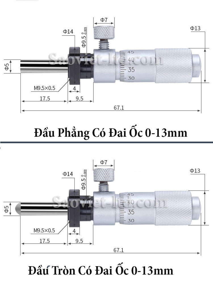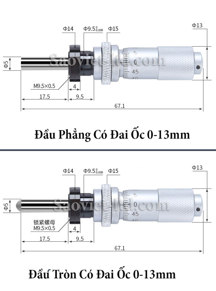 Đầu panme vi sai có vít tự khóa có các loại kiểu đầu tròn và đầu phẳng, tay siết nhanh kiểu ốc tay vặn hoặc ốc siết nhanh
