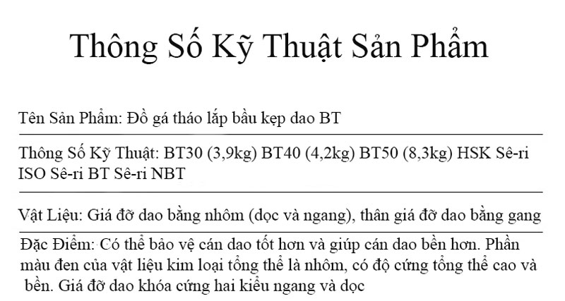 Thông Số Kỹ Thuật Và Thông Tin Sản Phẩm Đồ Gá Tháo Lắp Bầu Kẹp Dao BT