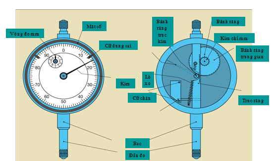 Cho đầu đo tiếp xúc với bàn máp, chỉnh đồng hồ đo chỉ số 0 sau đó đưa chi tiết vào đo. Số chỉ đồng hồ sẽ là kích thước tuyệt đối của chi tiết.