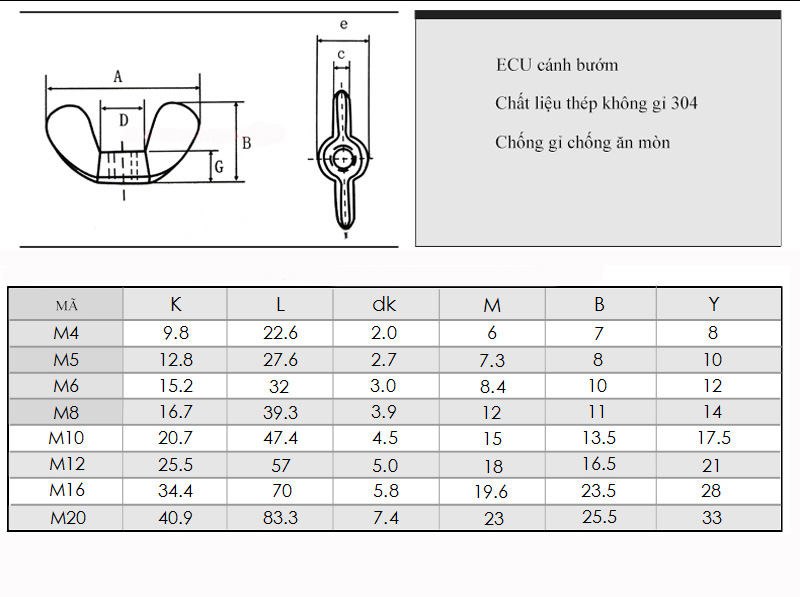 BẢNG THÔNG SỐ KỸ THUẬT ECU ĐAI ỐC CÁNH BƯỚM INOX
