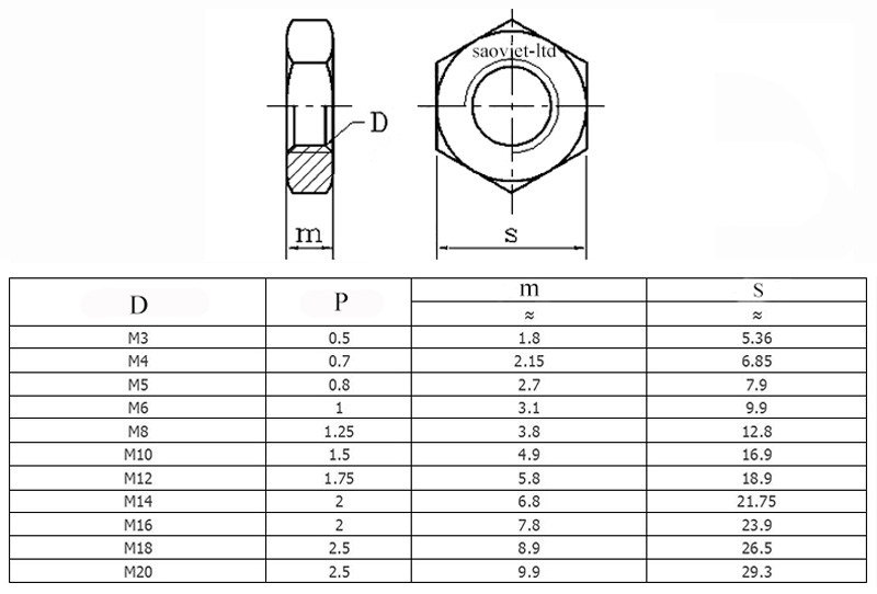 BẢNG THÔNG SỐ KỸ THUẬT ECU ĐAI ỐC LỤC GIÁC MỎNG INOX