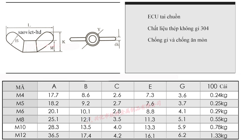 BẢNG THÔNG SỐ KỸ THUẬT ECU ĐAI ỐC TAI HỒNG INOX